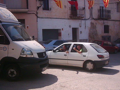 Tivissa, muntant i instal·lant i els 'fans' animant : "- No pete! No pete!"